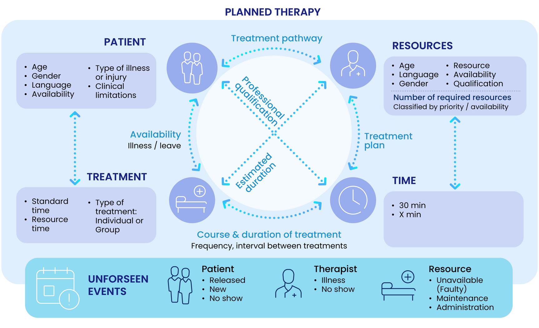 - Patient-specific constraints (ventilated patients, treatment breaks, feeding restrictions, etc)